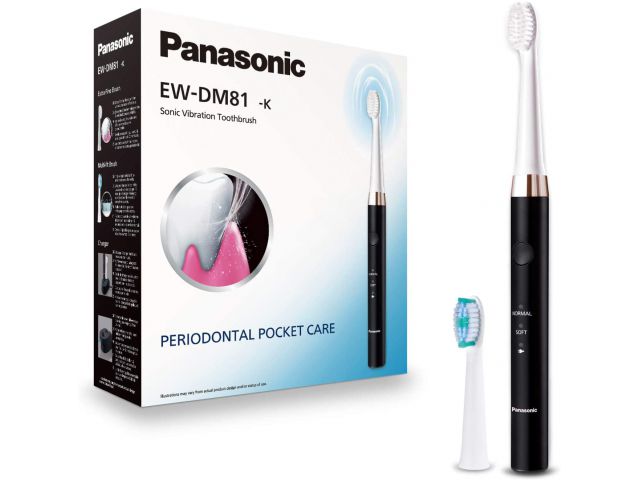 PANASONIC električna zobna ščetka EW-DM81-K503 Izjemno fine ščetine Da bi z zobno ščetko odstranili bakterije, skrite v obzobnih žepkih, ki povzročajo parodontalna obolenja, morajo konice ščetin imeti možnost vstopa v ozke žepe. Z originalno izjemno fino Panasonicovo krtačo, konice ščetin s premerom le pribl. 0,02 mm, so oblikovani tako, da dosežejo samo 3 mm široke obzobne žepke. Primerjava, kako zlahka ščetine vstopijo v parodontalne žepe. Slišne vibracije Ščetka vibrira s hitrostjo vrtenja pribl. 31.000 gibov/min, ki zagotavljajo fine, hitre premike čopiča. Kratke, hitre vibracije temeljito odstranijo zobne obloge iz obzobnih žepkov, hkrati pa zmanjšajo obremenitev zob in dlesni. Dva načina ščetkanja Izberite način REGULAR za običajno ščetkanje ali SOFT za mehkejše ščetkanje. Ščetkanje začne z nežnim draženjem, da ni nenadoma premočno. Začasno prekine ščetkanje za pribl. vsakih 30 sekund za enostavno merjenje časa ščetkanja. Izjemno tanka, ergonomska oblika Ohišje je izjemno tanko in lahko za enostavno uporabo. Stojalo za polnjenje Rezervoar/polnilnik za glavo in telo ščetke. Specifikacije Perivo 31.000 tresljajev na minuto 2 načina delovanja: normalen in mehak Tanka ergonomska oblika Izjemno fini lasje: dolžina 3 mm s premerom 0,02 mm Časovnik 30 sekund Funkcija progresivnega mehkega zagona 2 glavi v paketu Perivo