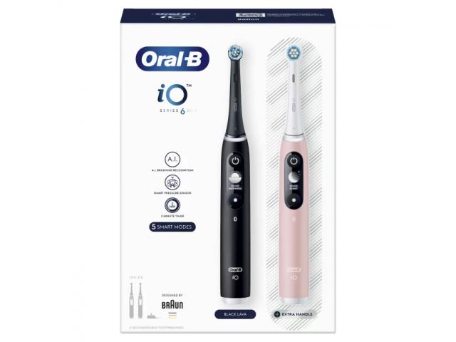 Oral-B iO6 postavlja nove standarde. Začenši z najnaprednejšo tehnologijo za najbolj temeljito, najnežnejše in najtišje ščetkanje zob do dizajna, ki naredi to ščetko neustavljivo. Ščetka iO združuje znamenito okroglo glavo zobne ščetke Oral-B z edinstvenimi nežnimi mikrovibracijami za 100 % bolj zdrave dlesni v enem tednu in do 100 % bolj učinkovito odstranjevanje zobnih oblog kot običajna klasična zobna ščetka. Električna zobna ščetka ima pametni senzor pritiska, ki v rdeči, beli in zeleni barvi kaže, ali ščetkate premočno, prelahko ali z zadostnim pritiskom, OLED zaslon prikazuje pomembne informacije: vključno z načini delovanja in opomnikom za zamenjavo glave , vas pozdravi ob vklopu in z nasmehom nagradi dobro opravljeno delo. Tkođer ima 5 načinov delovanja za umivanje zob, prilagojenih vašim potrebam: Daily Clean (vsakodnevno čiščenje), Sensitive (nežen), Gum Care (nega dlesni), Intense Clean (intenzivno čiščenje) in Whitening (beljenje), umetna inteligenca pa prepozna vaše slog ščetkanja in vas vodi do čim bolj temeljitega ščetkanja.