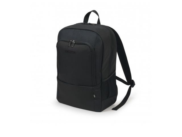 Dicota D30913 -RPET Base Backpack NB Case 15.6"/17.3" - črna Oblazinjen predal za prenosnik s HDF (peno visoke gostote) Prostoren glavni predal s predelki za dokumente in dodatnim prostorom za dodatke Sprednji žep s predelki za pisala, vizitke itd. Ergonomsko podloga zadaj Mrežasti stranski žepi z enostavnim dostopom Udobne, nastavljive naramnice Material: 300D rPET poliester Teža 0,7 kg Dimenzije torbe 340 x 480 x 150 mm za prenosnike 420 x 300 x 45 mm
