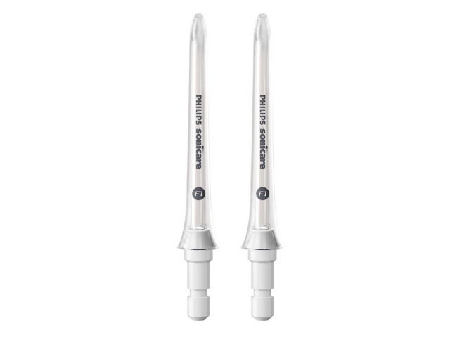 Standardna šoba F1 za redno čiščenje Za redno čiščenje uporabite standardno šobo. Uporablja en curek vode za odstranjevanje ostankov in temeljito čiščenje medzobnega prostora. Vodilna konica zagotavlja pravilen položaj Tanka kotna šoba in vodilna konica olajšata iskanje pravilnega položaja. Konico nastavka postavite tik nad rob dlesni, nežno pritisnite, da je konica nastavka v stiku z robom dlesni in zobmi, ter drsite od enega zoba do drugega