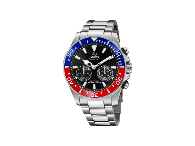 Ta ura Jaguar Hybrid Diver je popolna kombinacija analogne in pametne ure! Zapestnica ure dopolnjuje številčnico, kar daje uri edinstven in ekskluziven videz. Poleg tega je ura polna funkcij, kot so pedometer, samodejno prilagajanje časovnega pasu in prikaz datuma. S pomočjo gumbov ura omogoča daljinsko upravljanje kamere, pomoč pri iskanju izgubljenega telefona in upravljanje glasbe. Z uporabo GPS-a ure imate tudi možnost geografskega označevanja, da lahko na zemljevidu označite, kje ste bili, kar je popolno, če najdete kraj, kamor se preprosto morate vrniti! Vse skupaj je ovito v priljubljeni DIVER, ki ima premer 45,7 mm, robustno ohišje ure in safirno steklo. Za začetek preprosto prenesite aplikacijo Jaguar Connected – ne bi moglo biti lažje! Ta ura Jaguar Hybrid Diver je popolna kombinacija analogne in pametne ure! Zapestnica ure dopolnjuje številčnico, kar daje uri edinstven in ekskluziven videz. Poleg tega je ura polna funkcij, kot so pedometer, samodejno prilagajanje časovnega pasu in prikaz datuma. S pomočjo gumbov ura omogoča daljinsko upravljanje kamere, pomoč pri iskanju izgubljenega telefona in upravljanje glasbe. Z uporabo GPS-a ure imate tudi možnost geografskega označevanja, da lahko na zemljevidu označite, kje ste bili, kar je popolno, če najdete kraj, kamor se preprosto morate vrniti! Vse skupaj je ovito v priljubljeni DIVER, ki ima premer 45,7 mm, robustno ohišje ure in safirno steklo. Za začetek preprosto prenesite aplikacijo Jaguar Connected – ne bi moglo biti lažje!