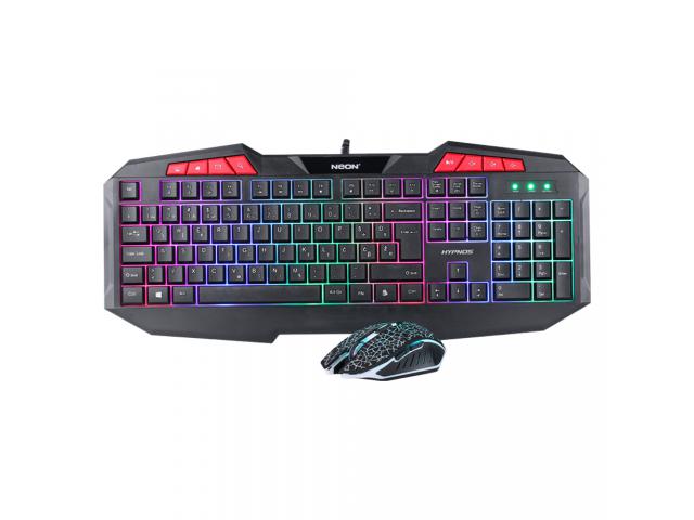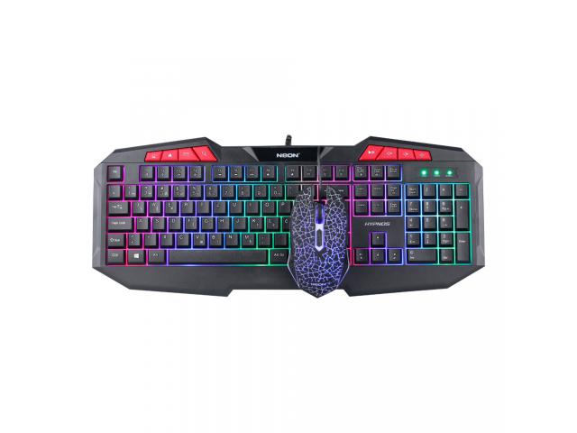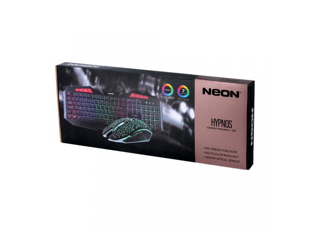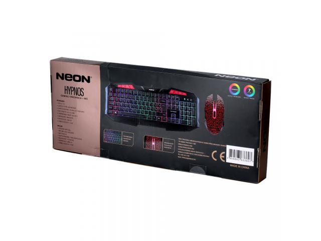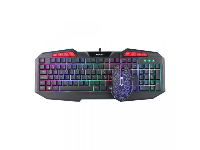 Kombinirana igralna tipkovnica in miška RGB osvetlitev tipkovnice Število tipk: 112 Vrsta stikala: membrana Število pritiskov tipk: 10 milijonov pritiskov Osvetlitev ozadja: mavrična Vmesnik: USB 2.0 Dolžina kabla: 1,5 M Osvetlitev igralne miške: 7 barv Senzor: Optični DPI : 800/ 1200/2400/3200 Število gumbov: 6 Število klikov: 3 milijone klikov Vmesnik miške: USB2.0 Dolžina kabla: 1,5M #NEONize