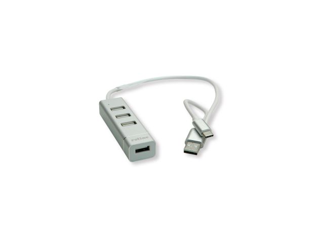USB-C HUB ROLINE 4-USB Port2.0, USB Type-A + USB-C kabli, 0,3 m
